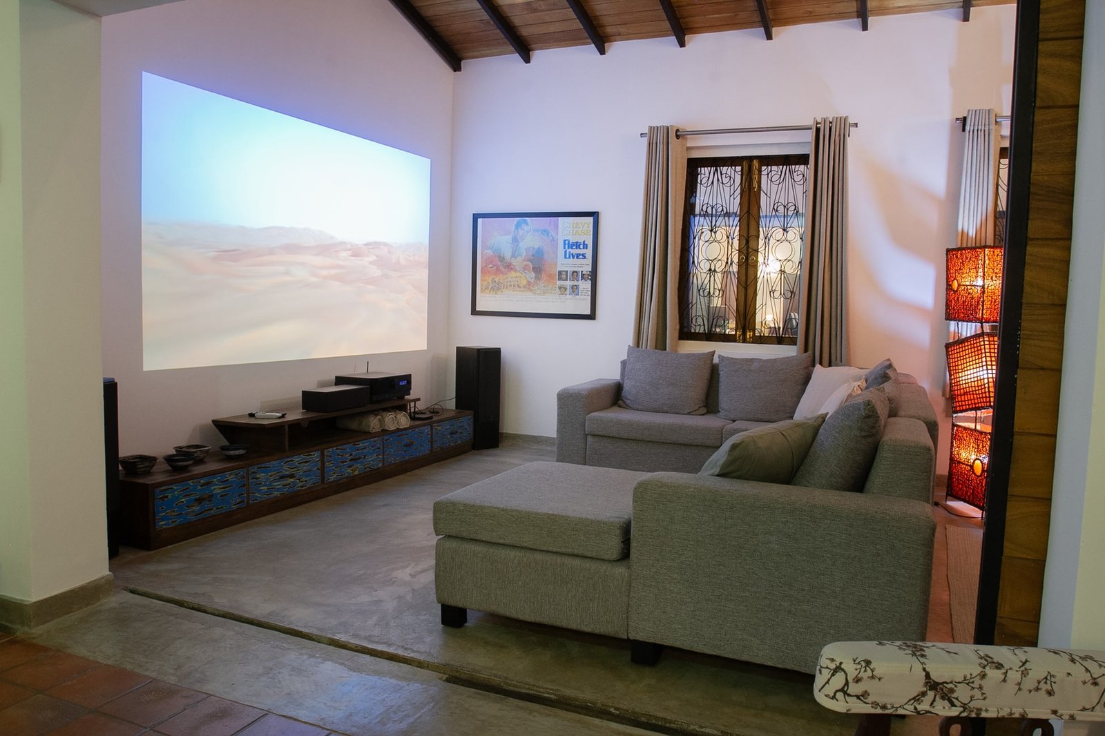 - Dedicated cinema room with a giant projector screen.
