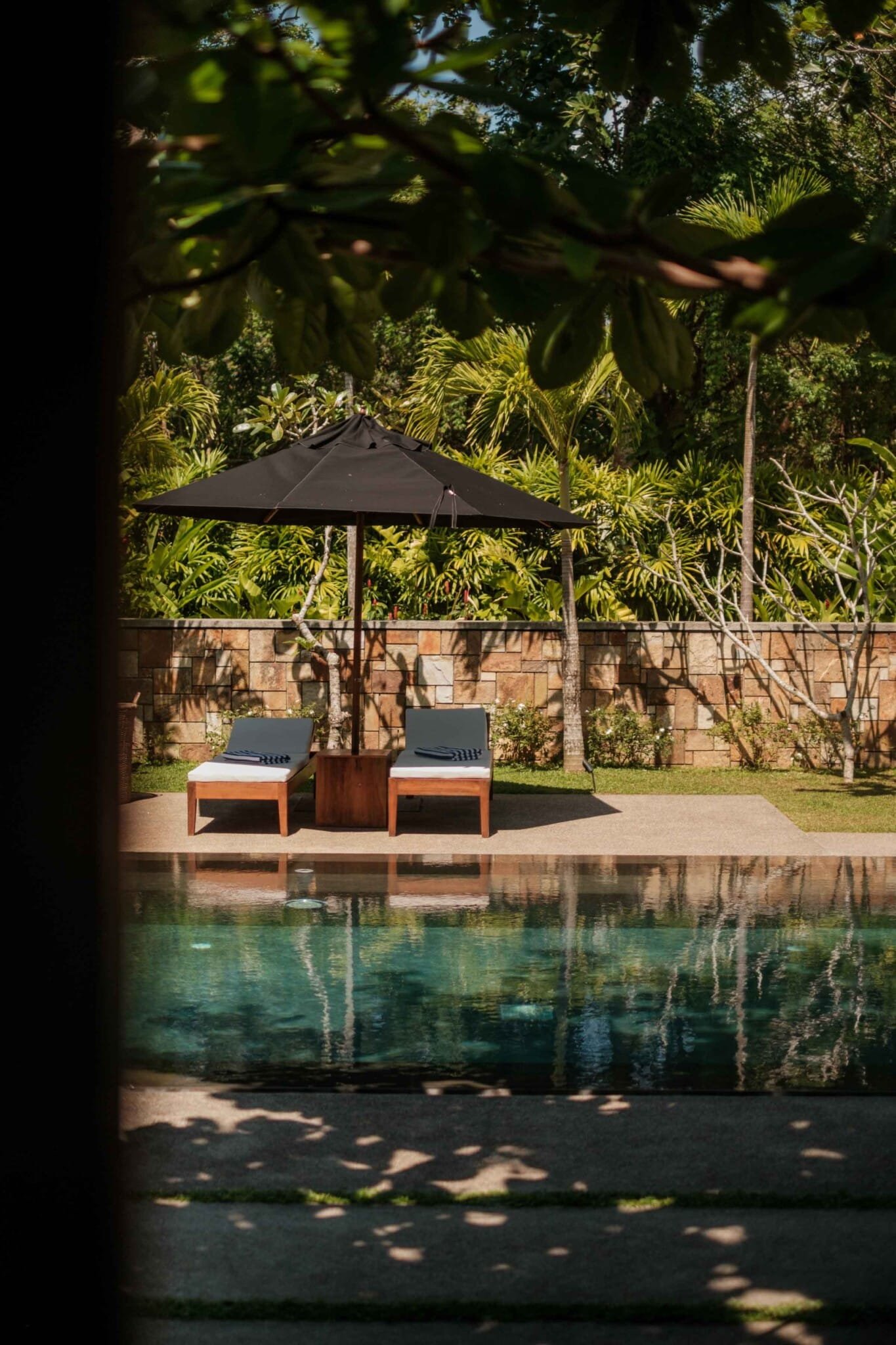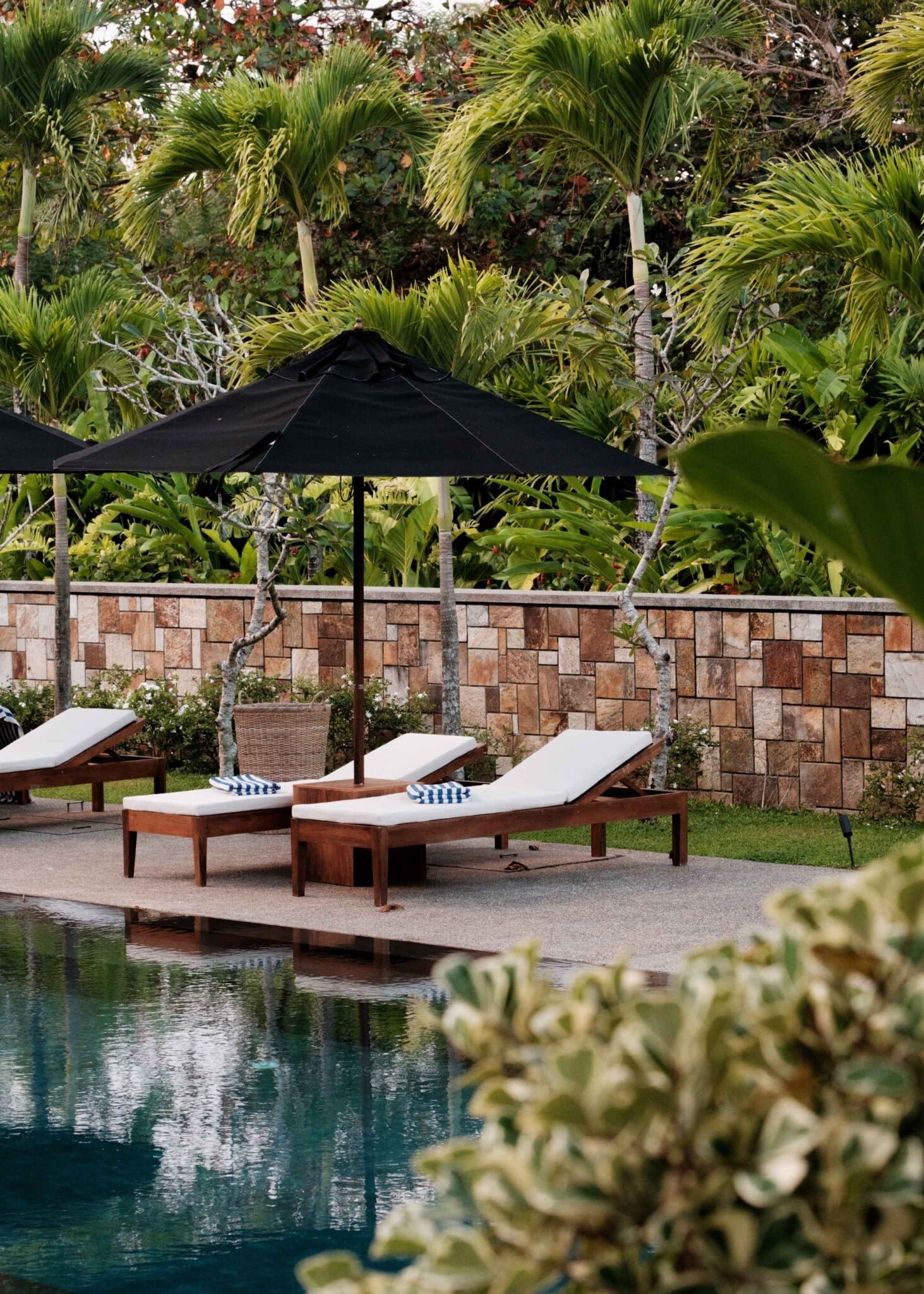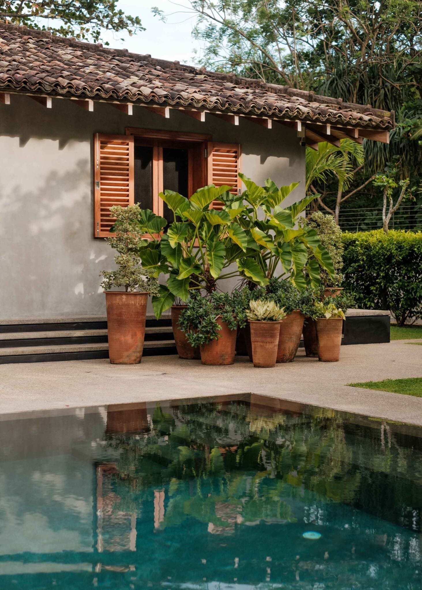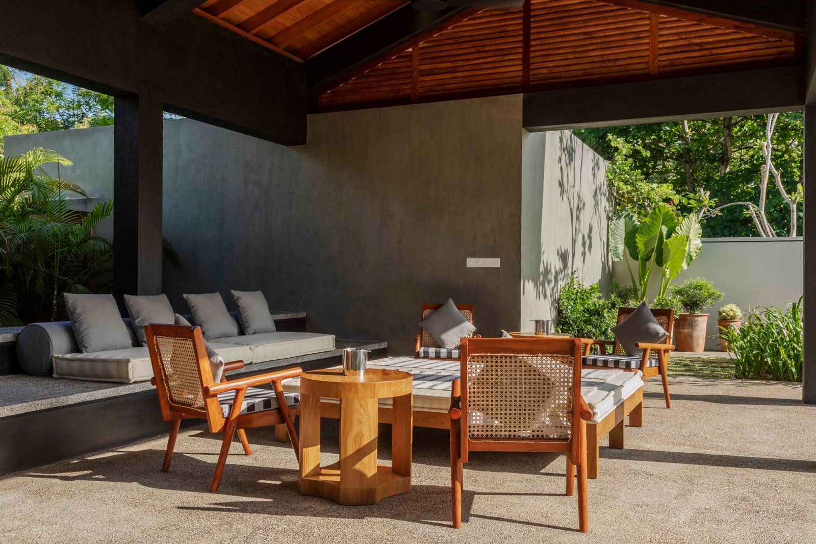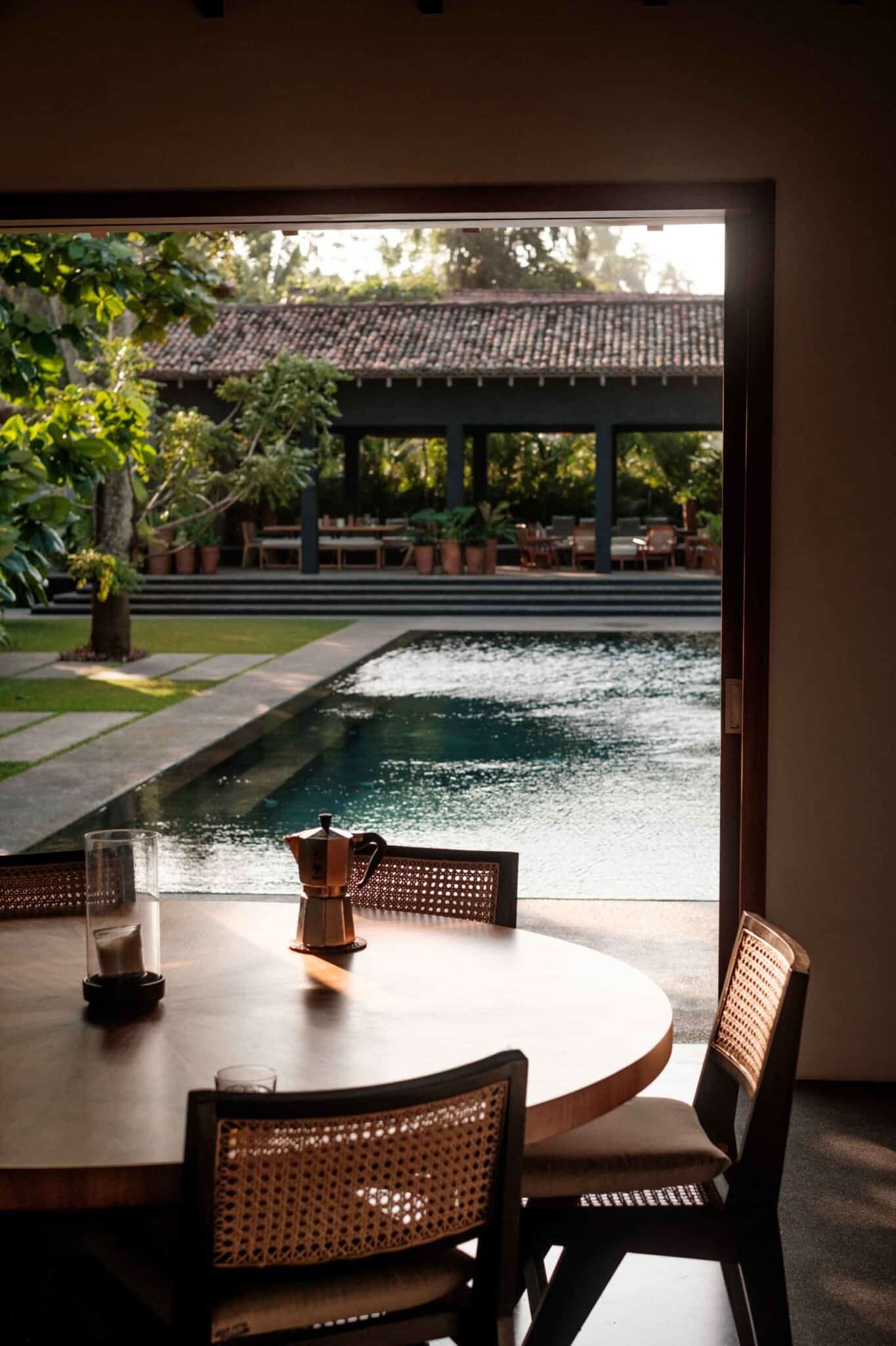 The space stays cool and airy throughout the day and opens directly to the pool and gardens.