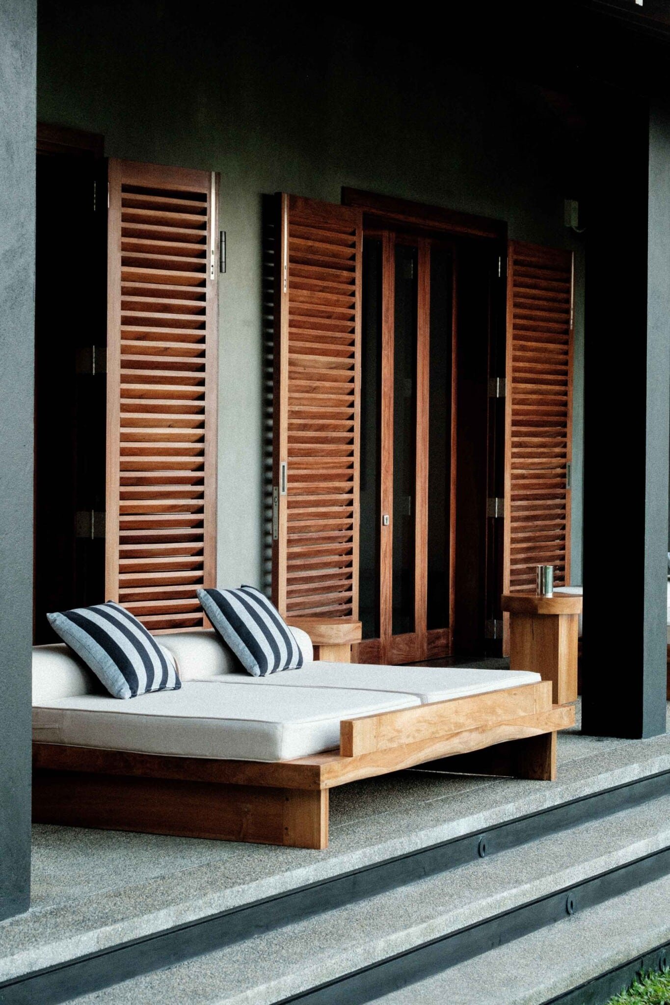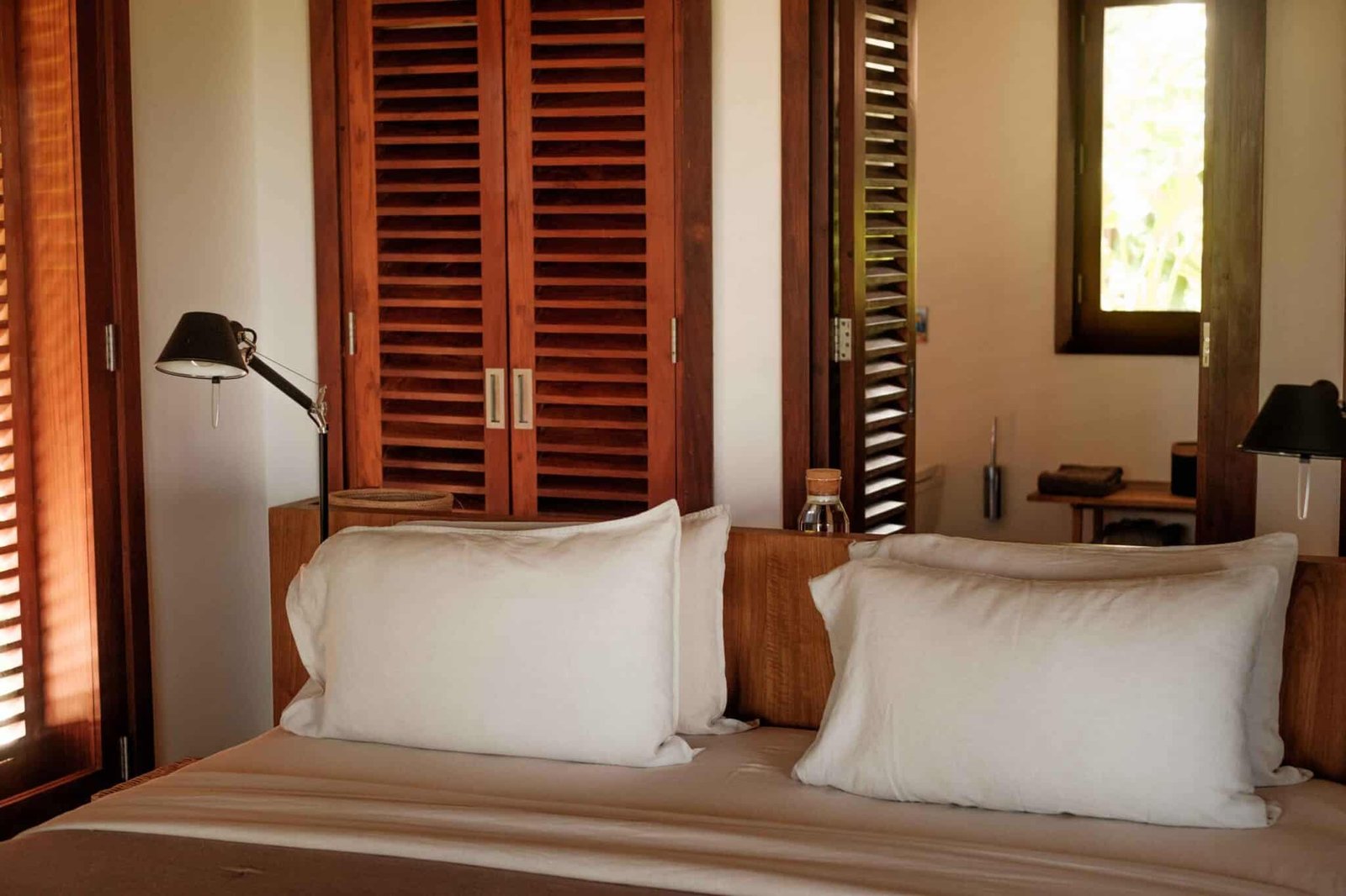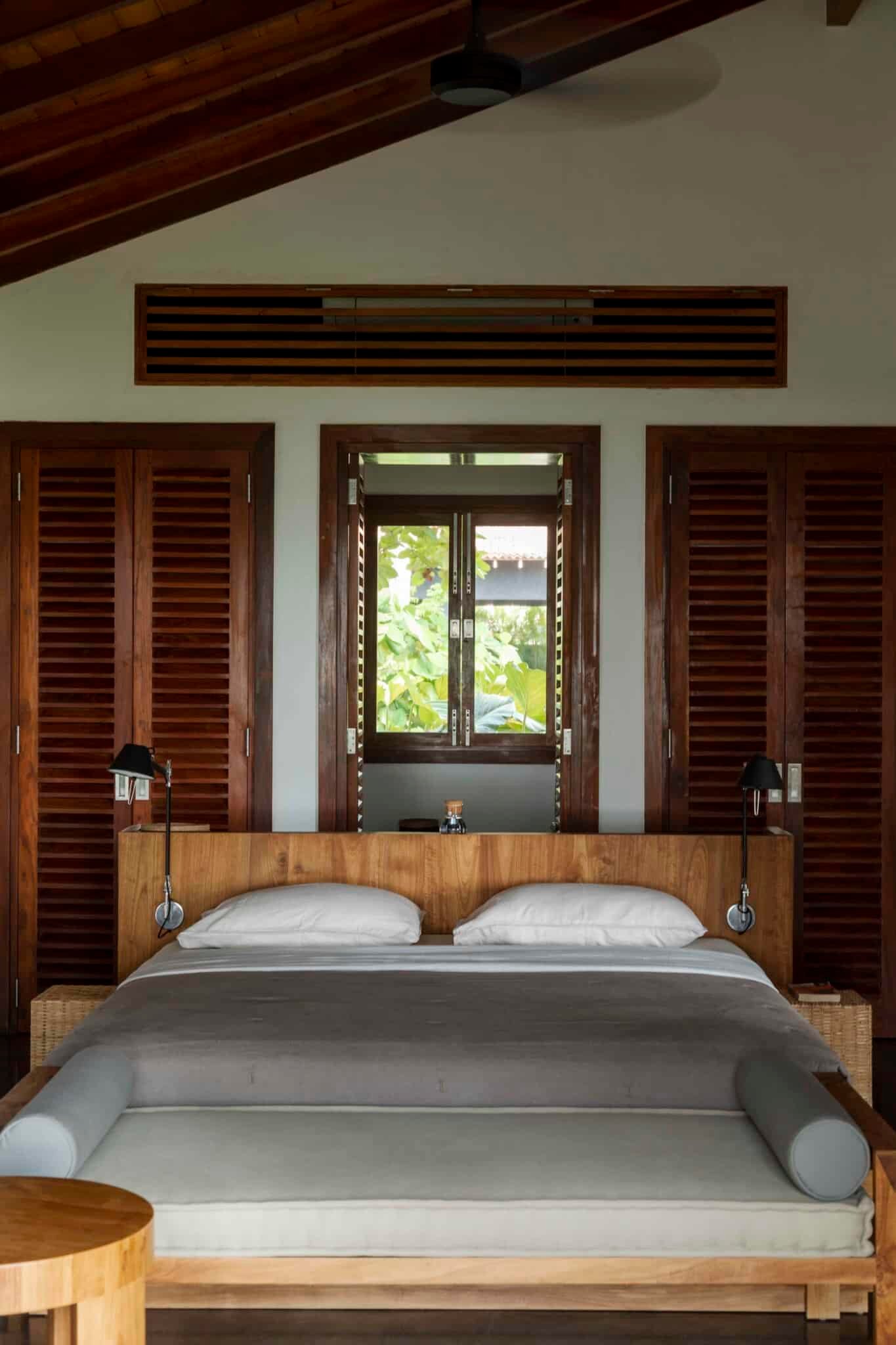 - Bedrooms feature teak beds, white linens, soft lighting, and wooden shutters