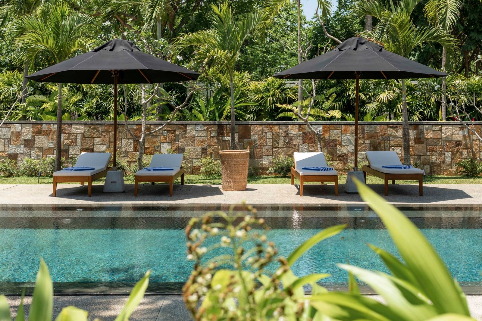 The villa is designed with modern tropical style and consists of three pavilions built around a long lap pool. Guests can enjoy open living spaces, comfortable bedrooms with en-suite bathrooms, and a large garden filled with palm trees and tropical plants. The villa also features a pool house, outdoor dining areas, and shaded lounges for relaxing by the sea.