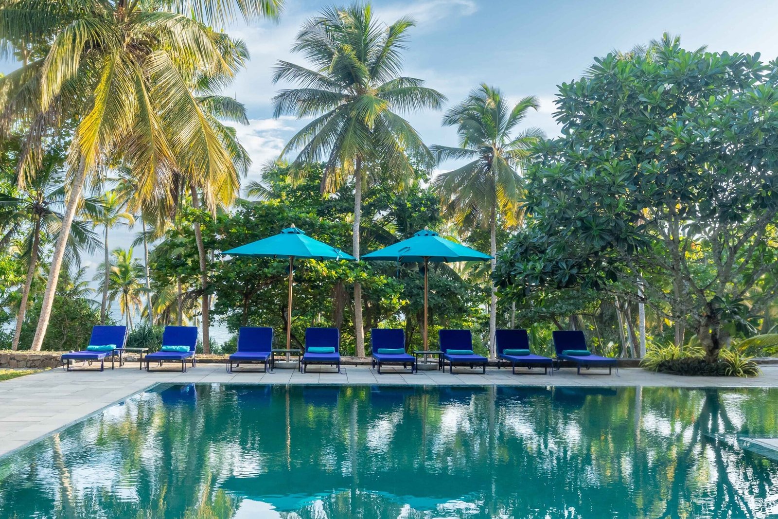 The swimming pool at Monara Villa in Tangalle is surrounded by coconut palms and lush gardens.