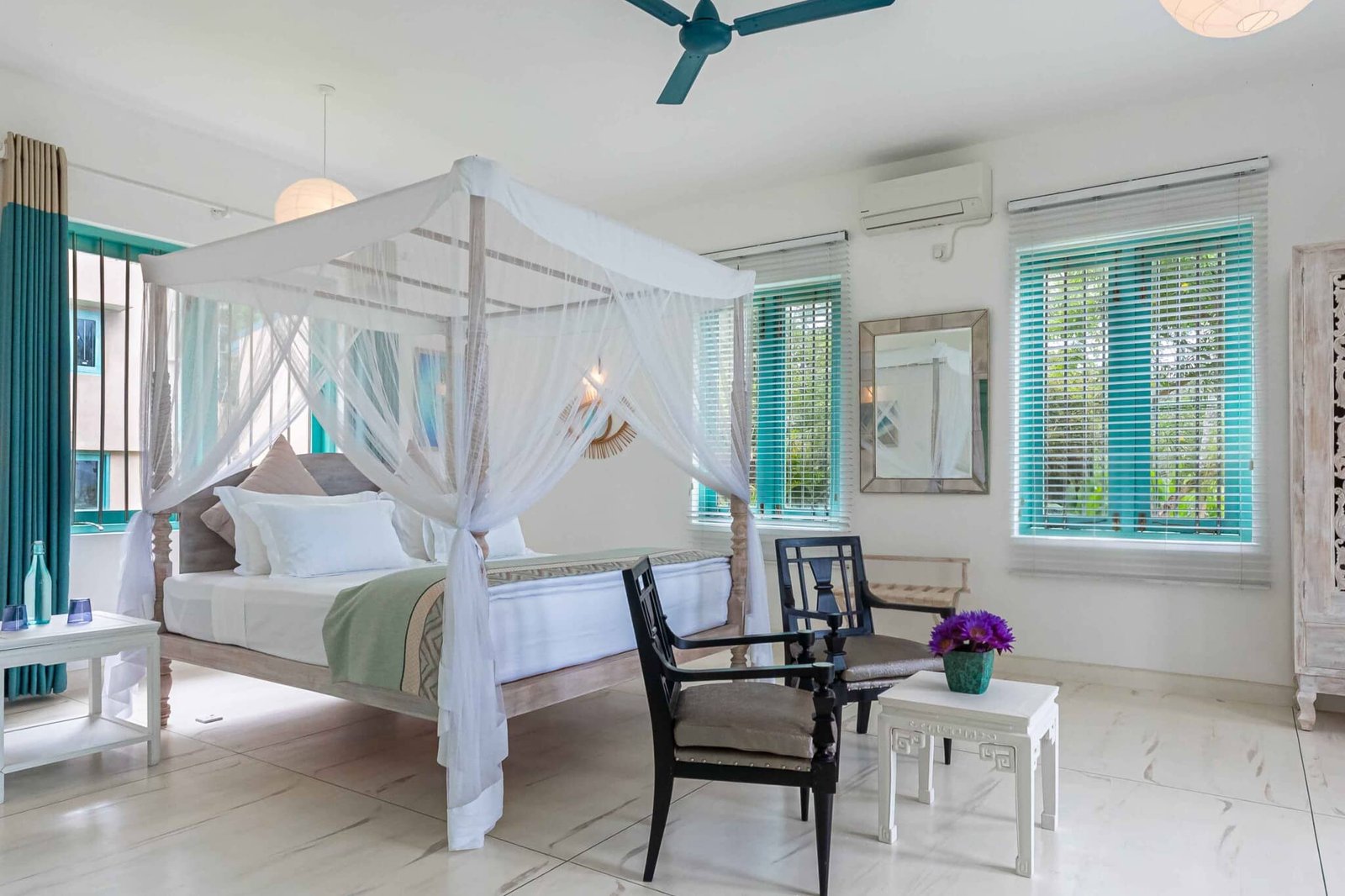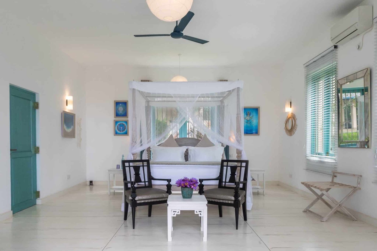 Each bedroom features calming interiors, air conditioning, and beautiful views of the ocean or garden.