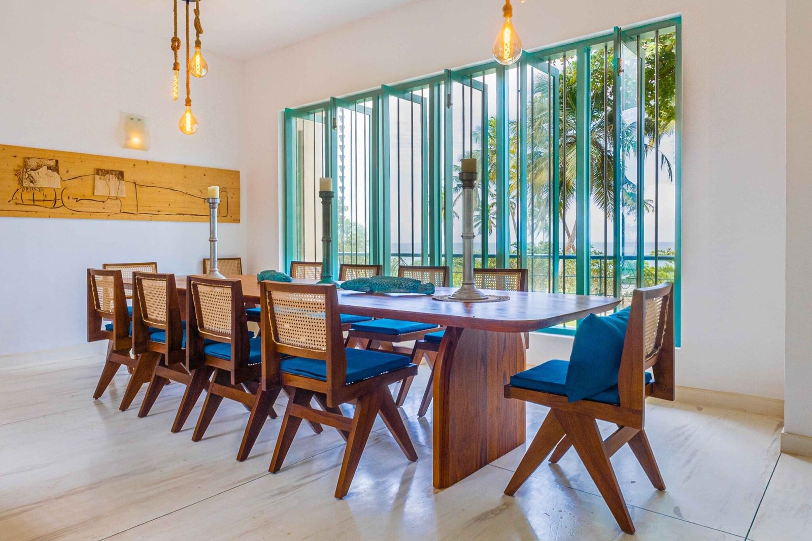 The open-plan living and dining spaces at Monara Villa in Tangalle are bright, colourful, and full of natural light.