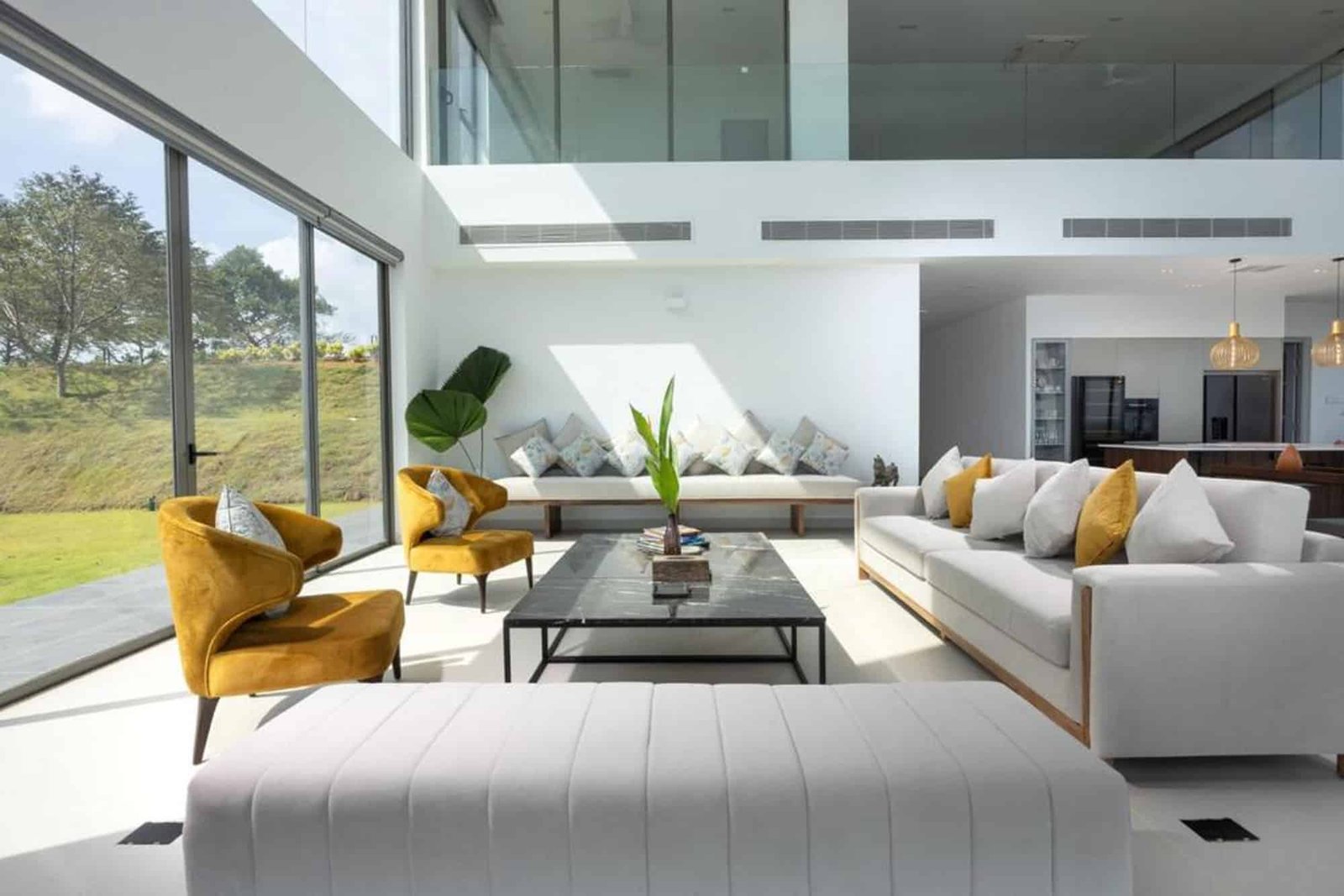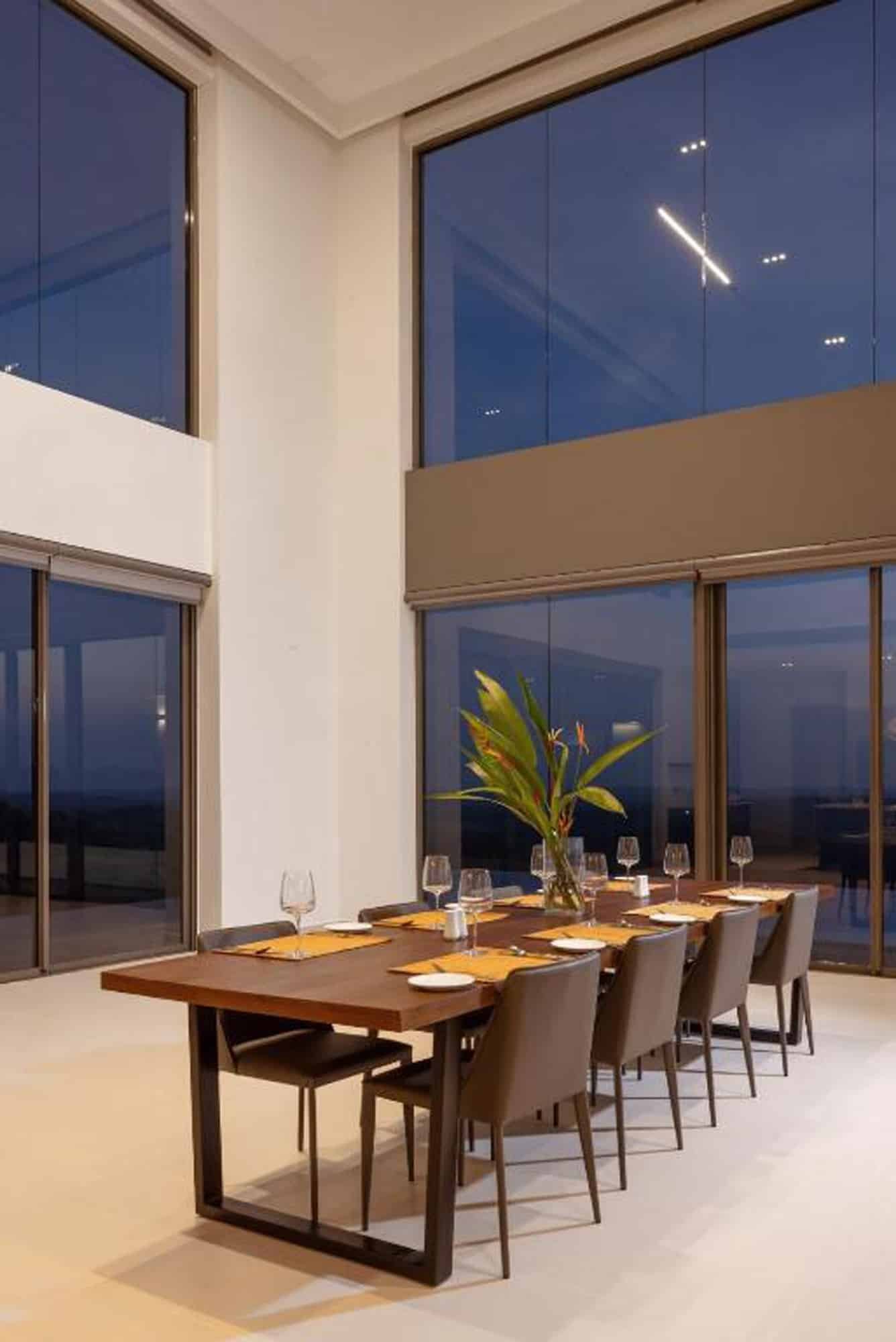 - Built with large glass windows for bright spaces.