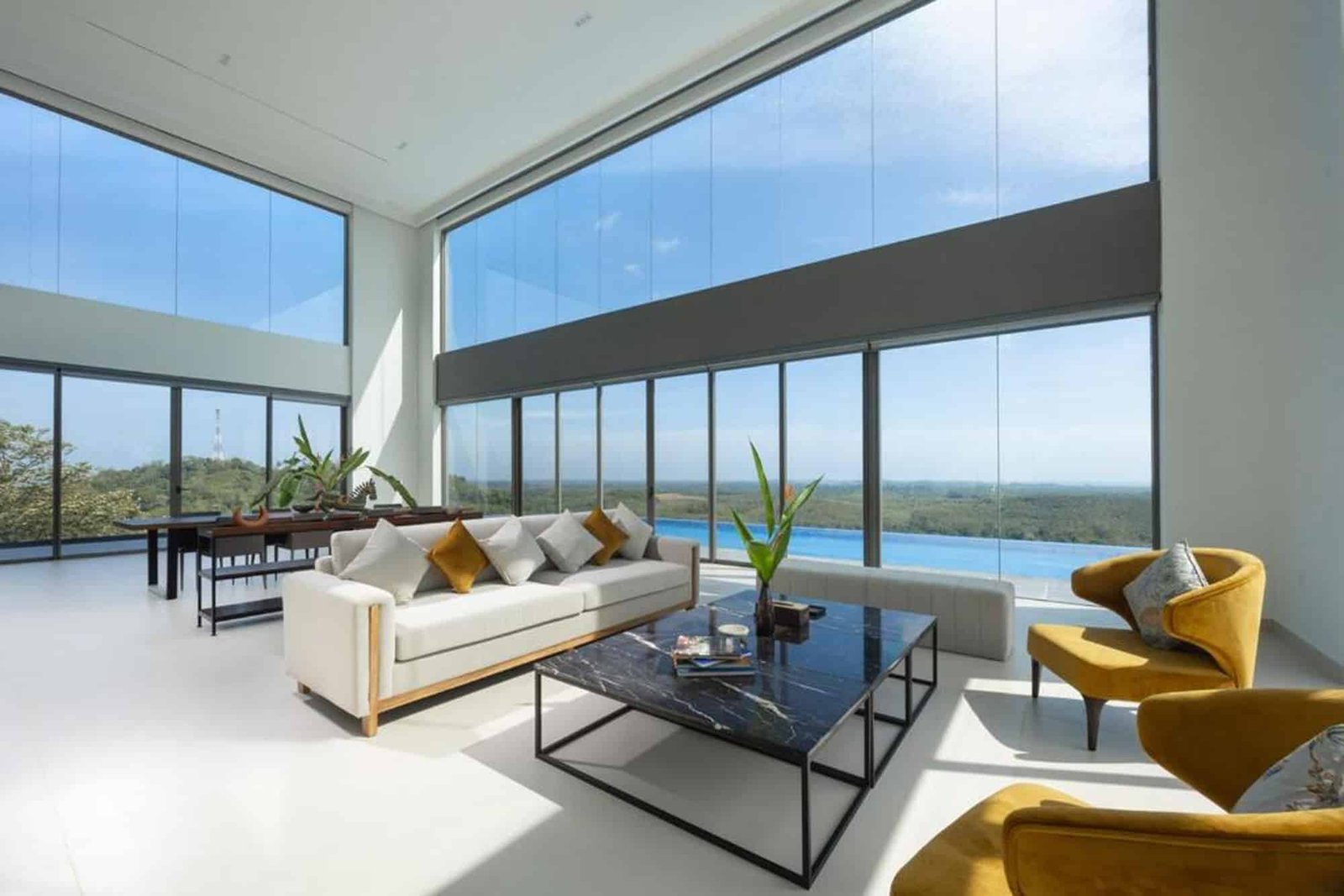 - Living spaces have modern interiors and floor-to-ceiling windows.