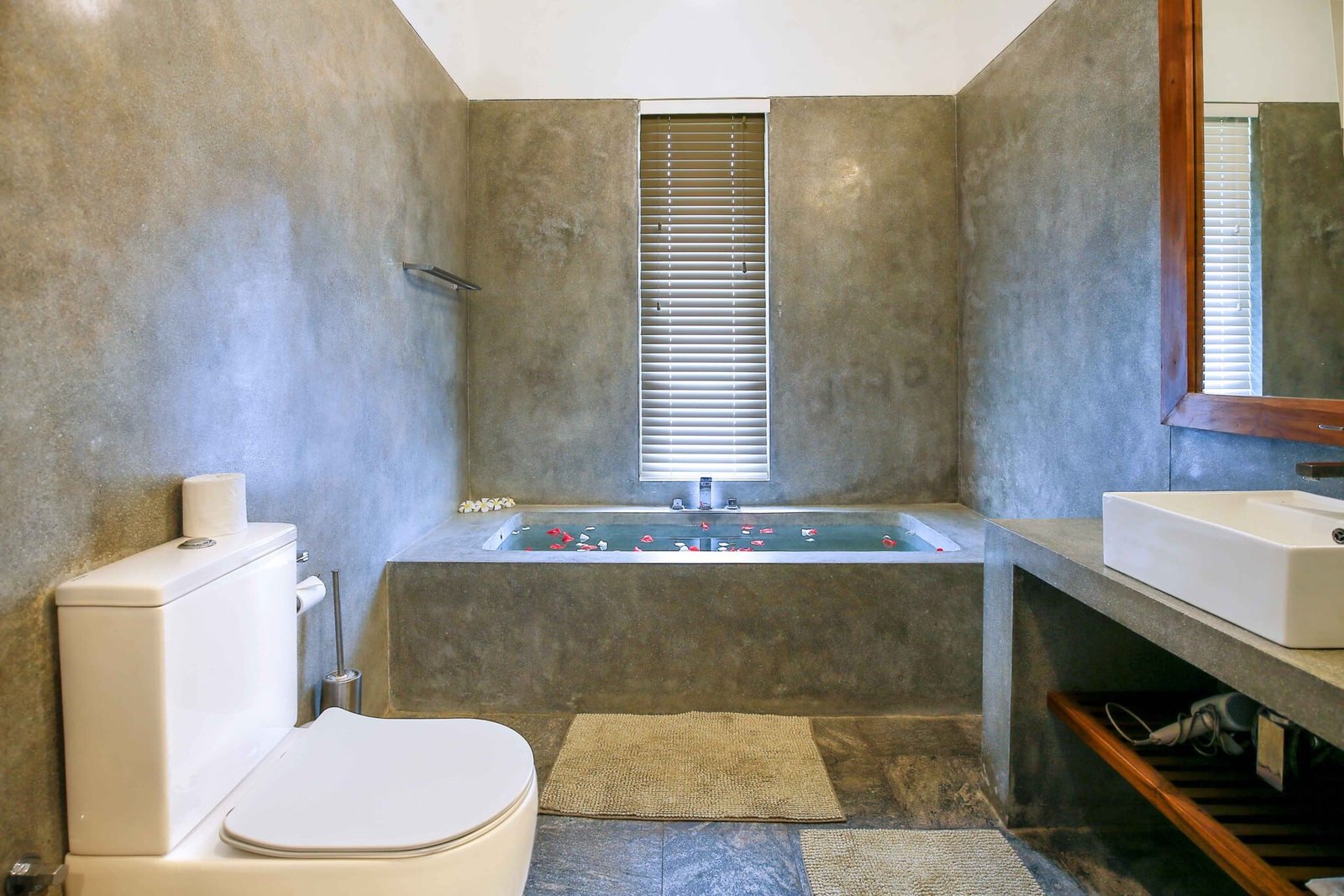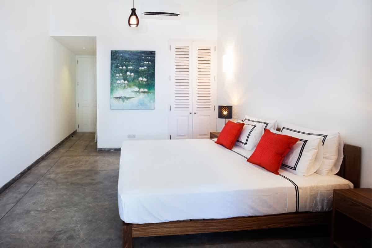 - Beautiful colonial-style design with white walls, polished and textured concrete floors, and timber furniture.