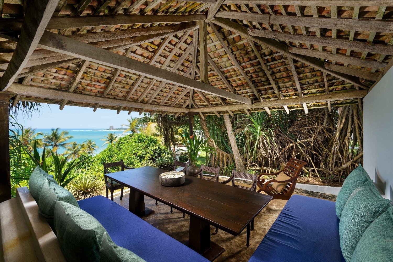 Pointe Sud is a beautiful 4-bedroom villa located in Mirissa, offering a perfect mix of privacy, luxury, and natural beauty. Set on a cliff 75 feet above the beach, the villa gives you amazing, uninterrupted views of the Indian Ocean. It has 4 spacious bedrooms, each with its own bathroom and air-conditioning, so up to 8 guests can stay comfortably. The master bedroom also has its own private garden, adding extra luxury. The main living area has high ceilings and lovely teakwood flooring, creating an open and airy atmosphere. The large covered verandah is the heart of the villa, with a dining table and comfortable seating, making it a perfect place to relax and enjoy the view.
