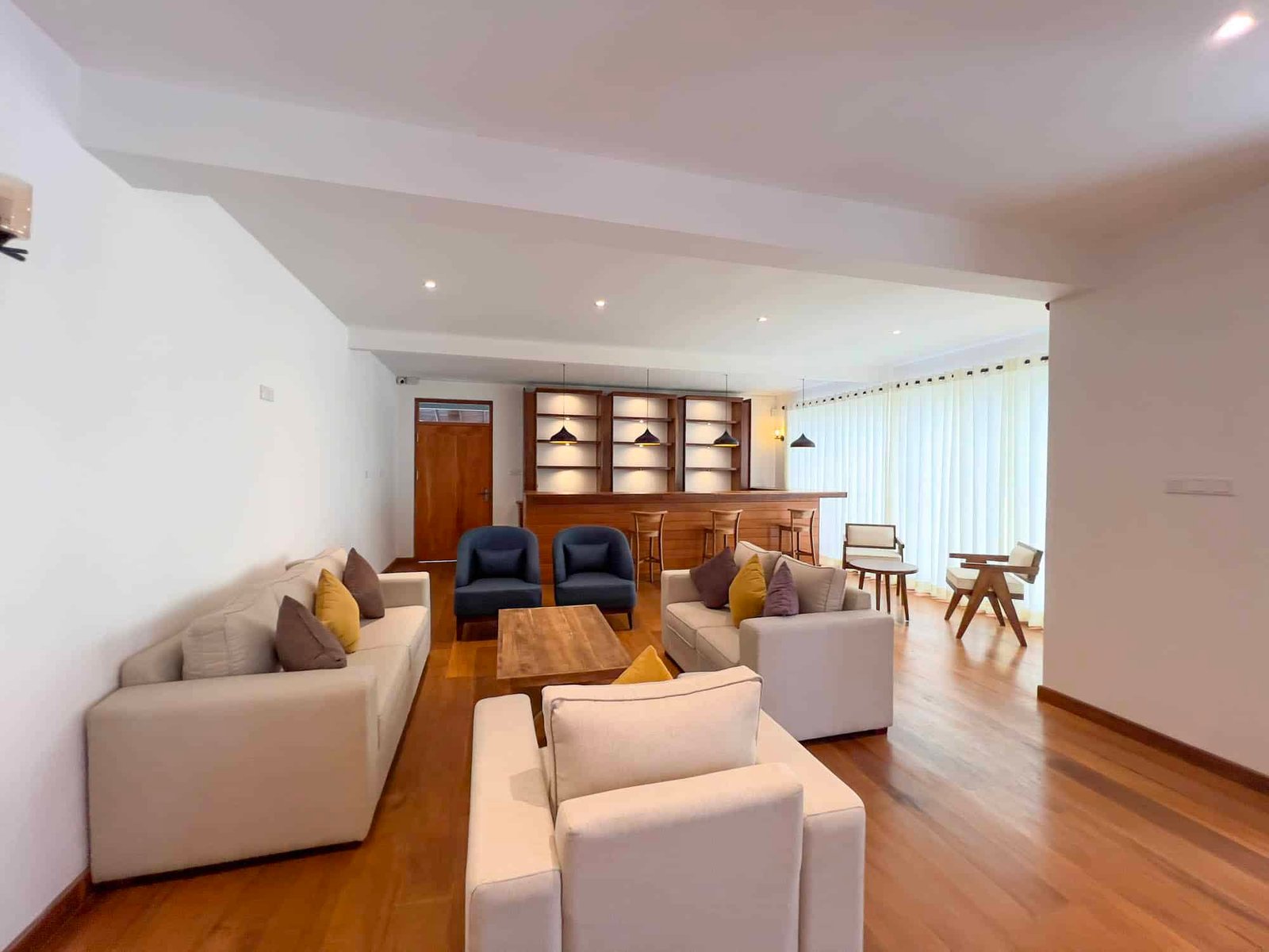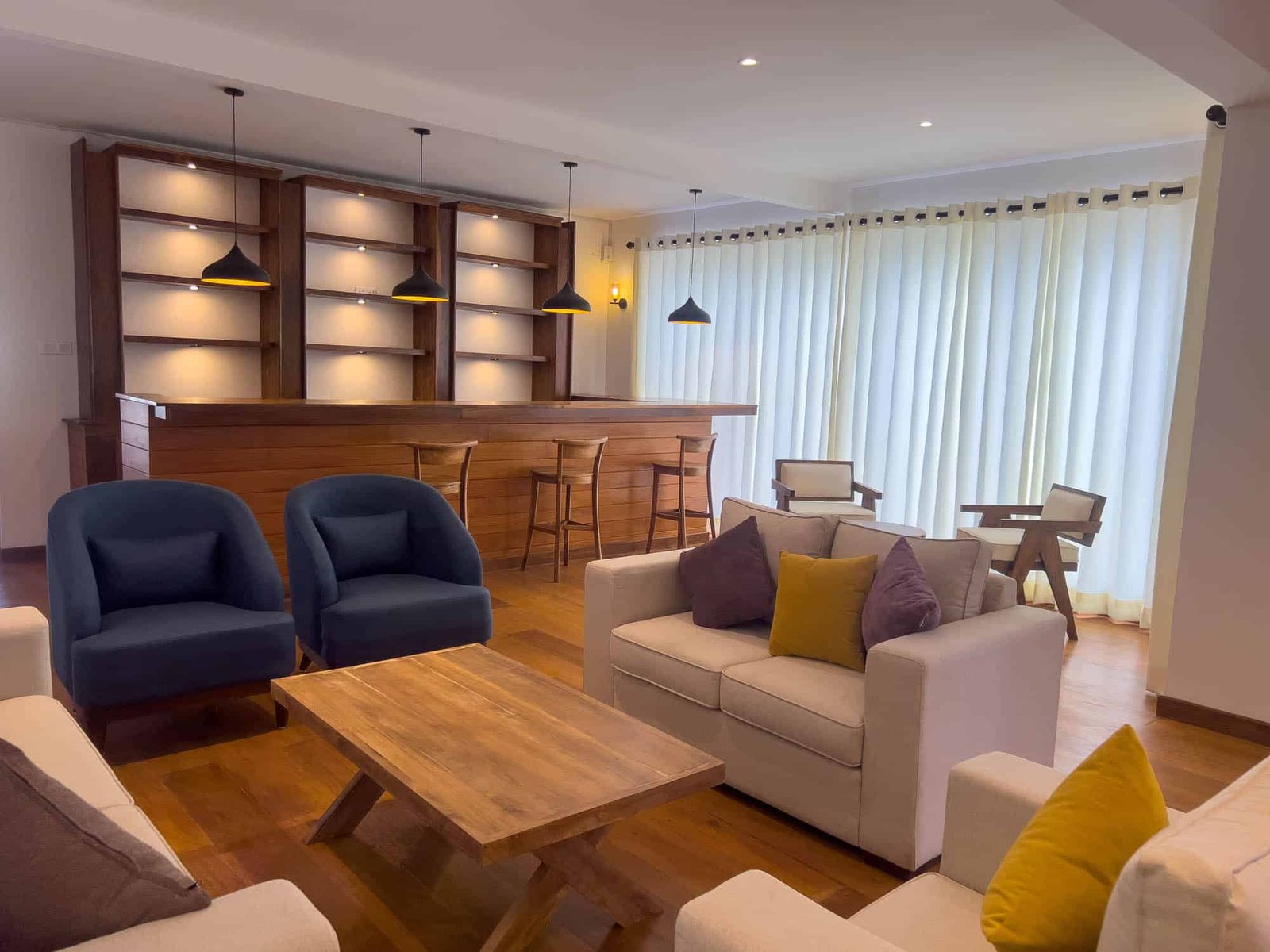On the right side, there is a large lobby area with luxury sofas, perfect for relaxing with family or friends.
