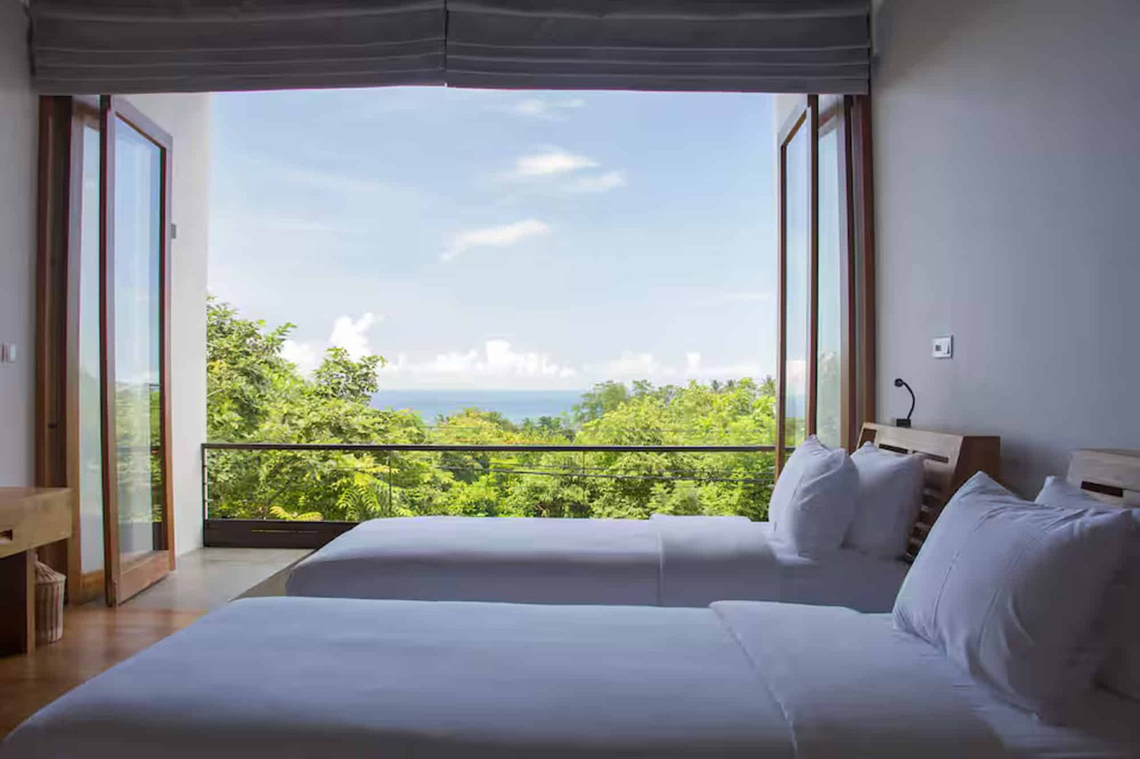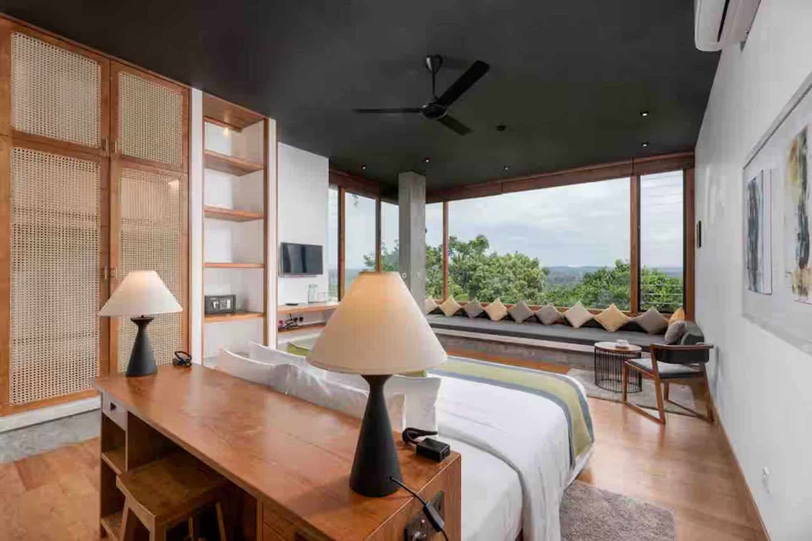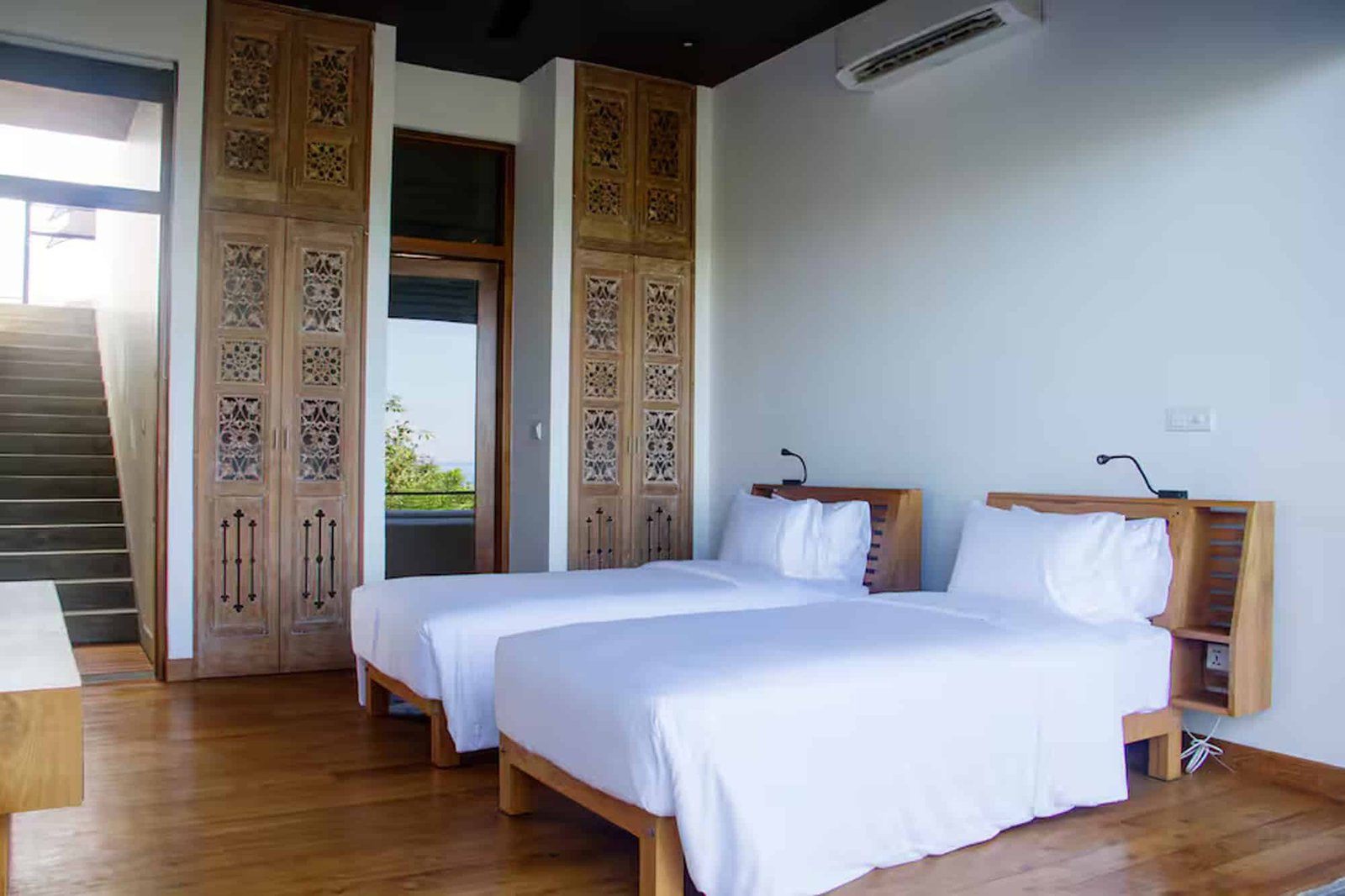 Unawatuna Heights Estate is a modern hilltop villa made up of two identical villas – Unawatuna North and Unawatuna South. Each villa has its own private living and dining space. The living areas are bright and open, with full glass walls that bring in natural light and give beautiful views of the hills and ocean. When booked as a full estate, a connecting door can be opened to create one large open living space, perfect for groups.Bedrooms