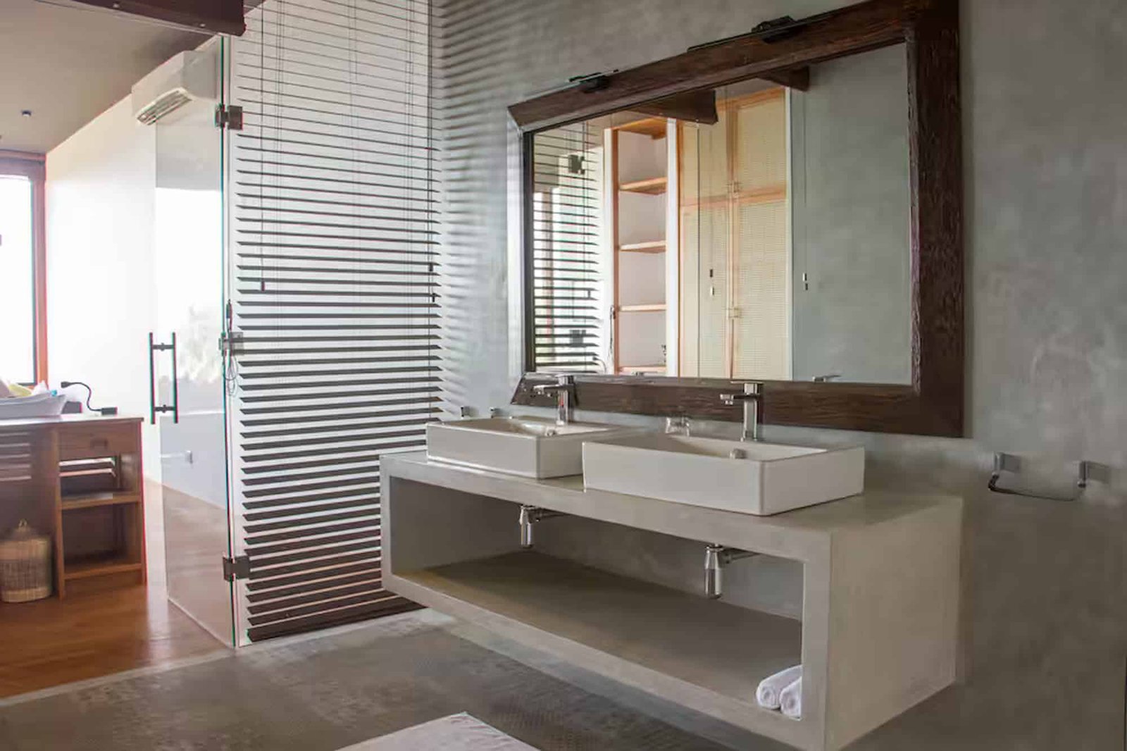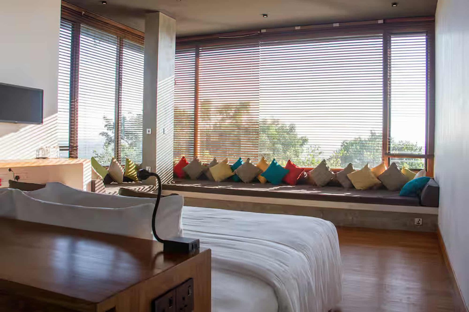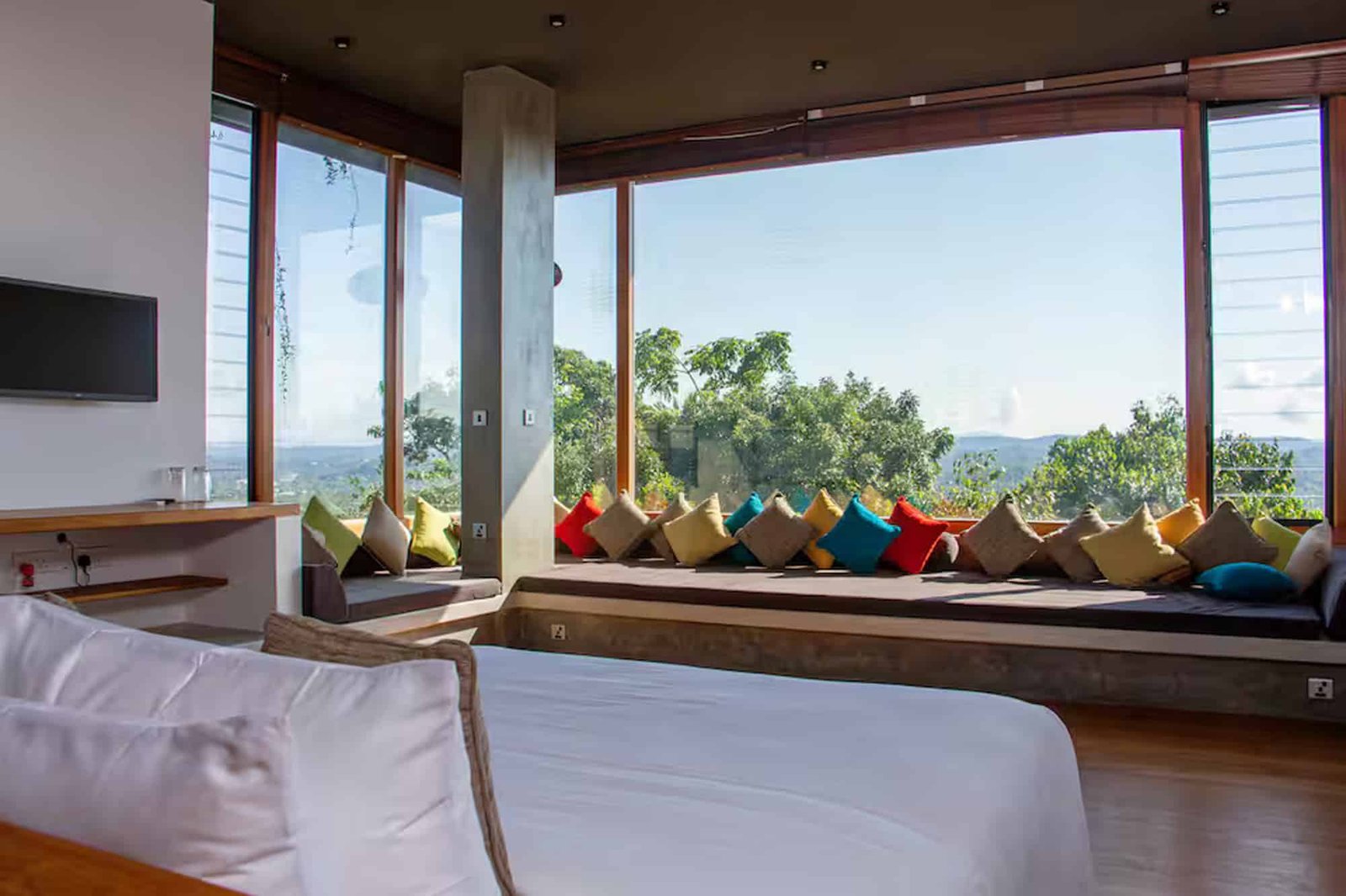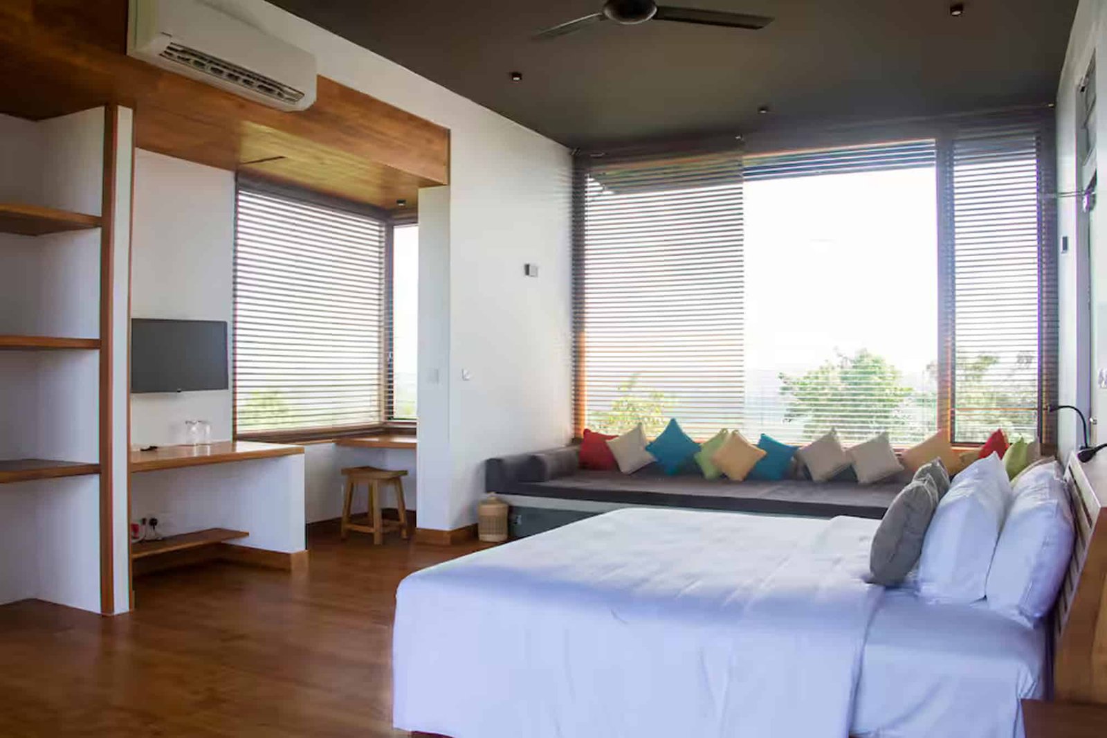 Unawatuna Heights Estate is a modern hilltop villa made up of two identical villas – Unawatuna North and Unawatuna South. Each villa has its own private living and dining space. The living areas are bright and open, with full glass walls that bring in natural light and give beautiful views of the hills and ocean. When booked as a full estate, a connecting door can be opened to create one large open living space, perfect for groups.Bedrooms